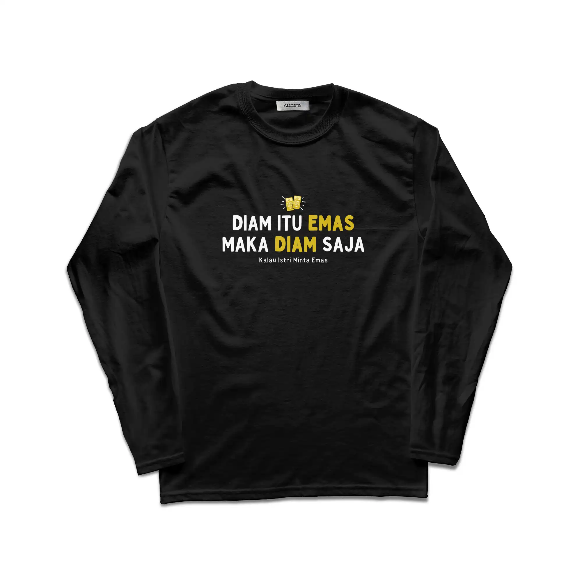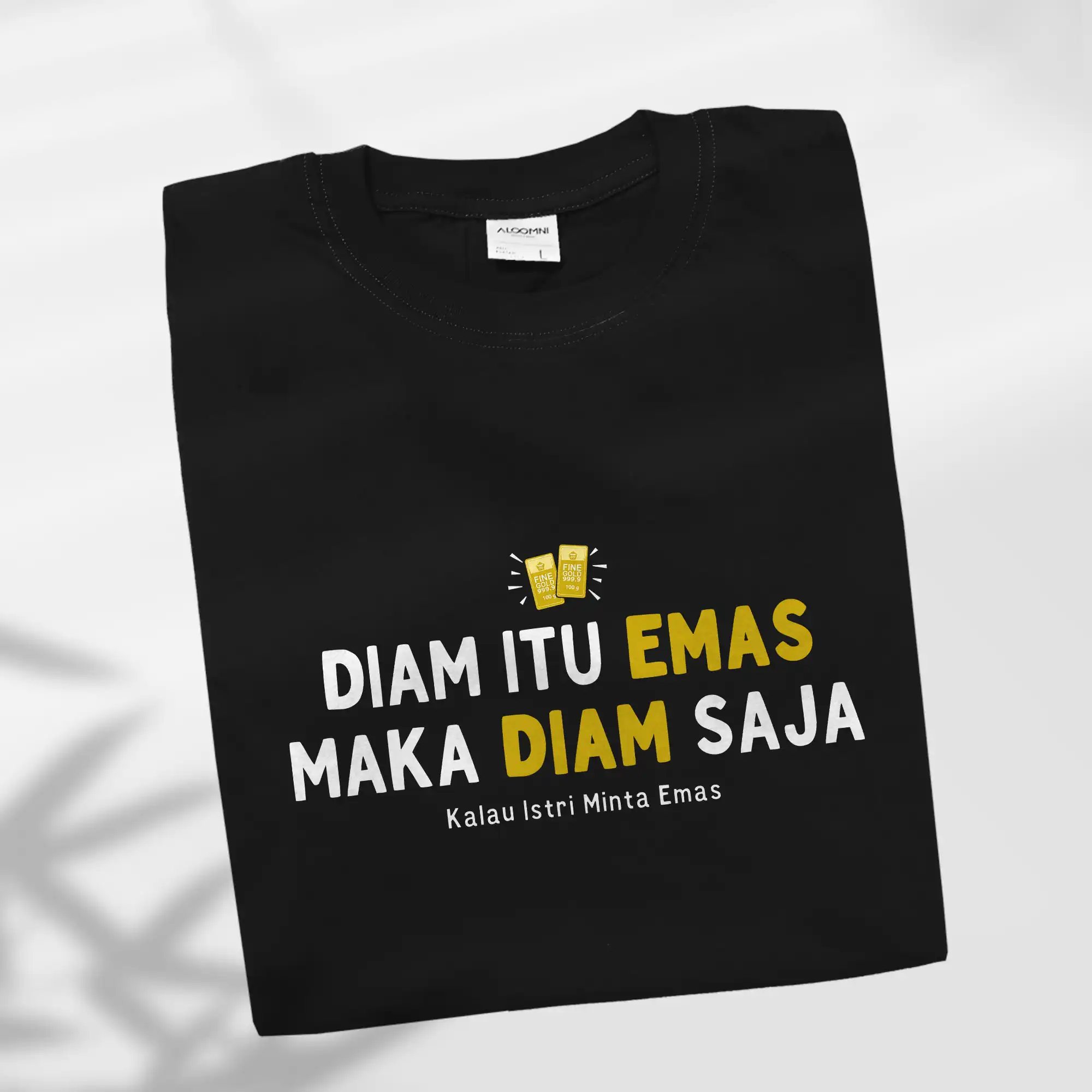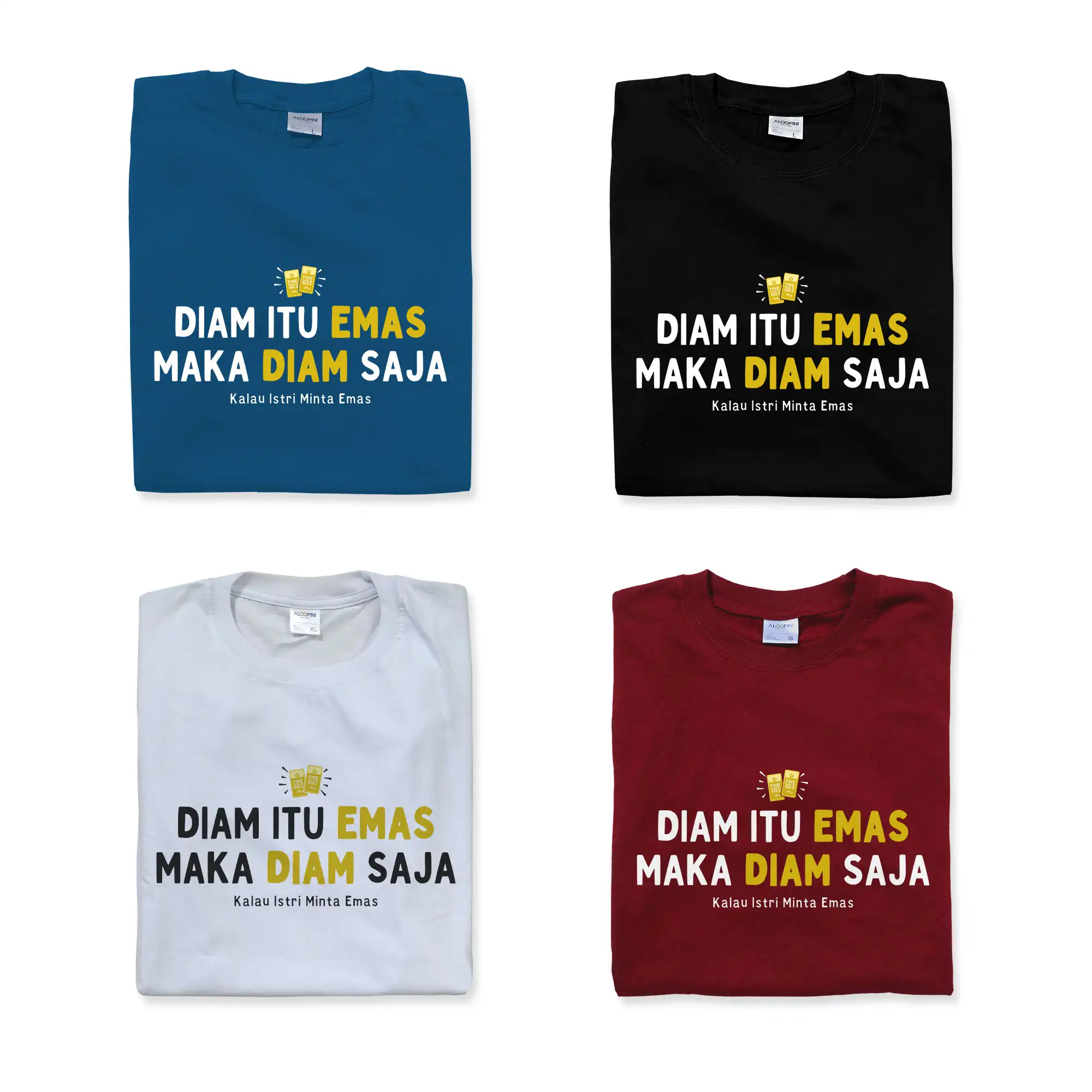 Diam itu Emas, maka diam saja kalau istri minta emas. Kaos pelesetan kocak andalan suami saat dompet menipis. Awas ketahuan menteri keuangan di rumah! 100% Original Aloomni.